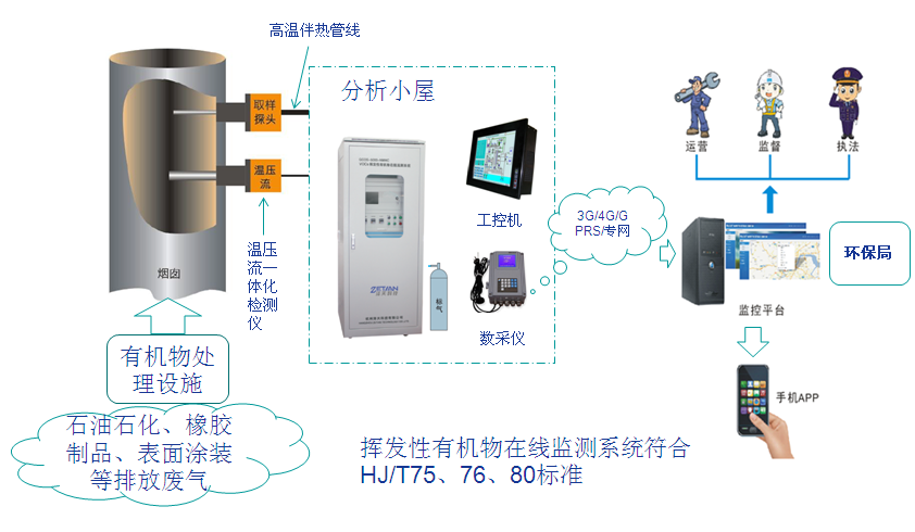 揮發(fā)性有機物煙氣排放連續(xù)監(jiān)測系統(tǒng)采用先進的全程伴熱預處理+在線色譜技術(shù)+火焰離子檢測法(FID),主要應用于對各種工業(yè)污染源排放有機物的實時監(jiān)測,本系列在線氣相色譜分析儀采用國際先進技術(shù),性能穩(wěn)定可靠,自動化程度高,檢測范圍寬,能夠測量VOCS、總烴(THC)、非甲烷總烴(NMHC)、苯及苯系物等多項參數(shù),對VOCS的濃度和排放率進行連續(xù)、實時地跟蹤監(jiān)控,并將所有的監(jiān)測參數(shù)傳輸至工控機軟件和用戶DCS系統(tǒng),可通過數(shù)采儀與環(huán)保部門的數(shù)據(jù)系統(tǒng)通訊。系統(tǒng)設(shè)備放置在分析小屋內(nèi),操作和維護方便,具有現(xiàn)場數(shù)據(jù)實時傳送、遠程故障診斷等功能,實現(xiàn)了工作現(xiàn)場的無人值守。整套系統(tǒng)結(jié)構(gòu)簡單,模塊化設(shè)計,穩(wěn)定性強,運行成本低。